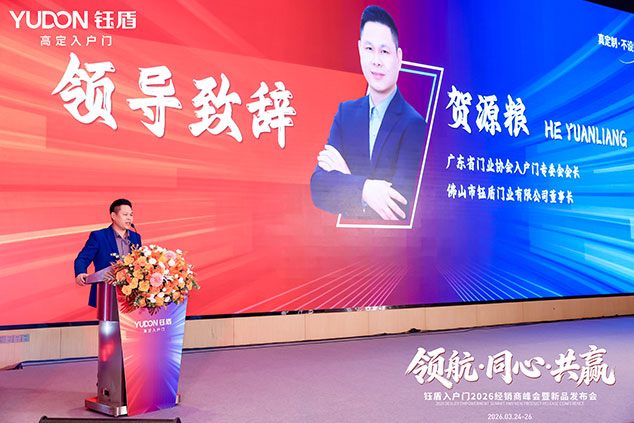 峰会伊始,智慧与共识在此凝聚,广东省门业协会入户门专委会会长、钰盾入户门董事长贺源粮先生发表开幕致辞。他深刻分析了行业机遇与挑战,感谢了经销商伙伴的并肩奋斗,并明确指出钰盾入户门将以品质为初心、以创新为驱动,与所有家人同心开拓经销商渠道、工程渠道和外贸渠道三大事业新版图。