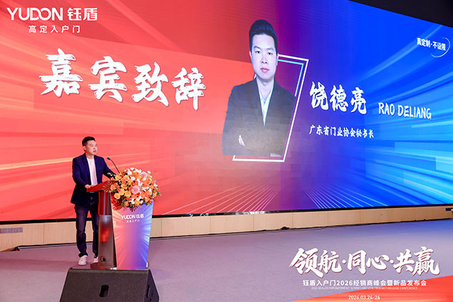 本次峰会亦得到行业协会的高度关注与支持,广东省门业协会秘书长饶德亮先生亲临现场并致辞。他代表协会对钰盾入户门成立17年来的成就表示祝贺,并充分肯定了其在产品创新与行业规范发展中的引领作用。他指出,钰盾入户门凭借扎实的制造根基、持续的研发投入与完善的渠道体系,已成为入户门行业典范,并于2025年先后获评“广东省门业协会入户门专委会会长单位”与“好门窗示范企业”。期待其未来继续发挥标杆作用,携手推动行业高质量发展。